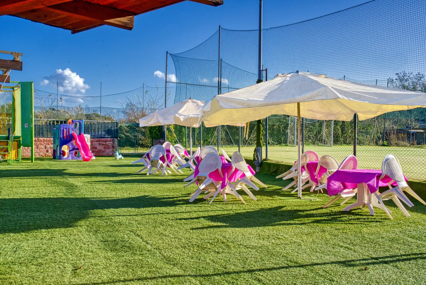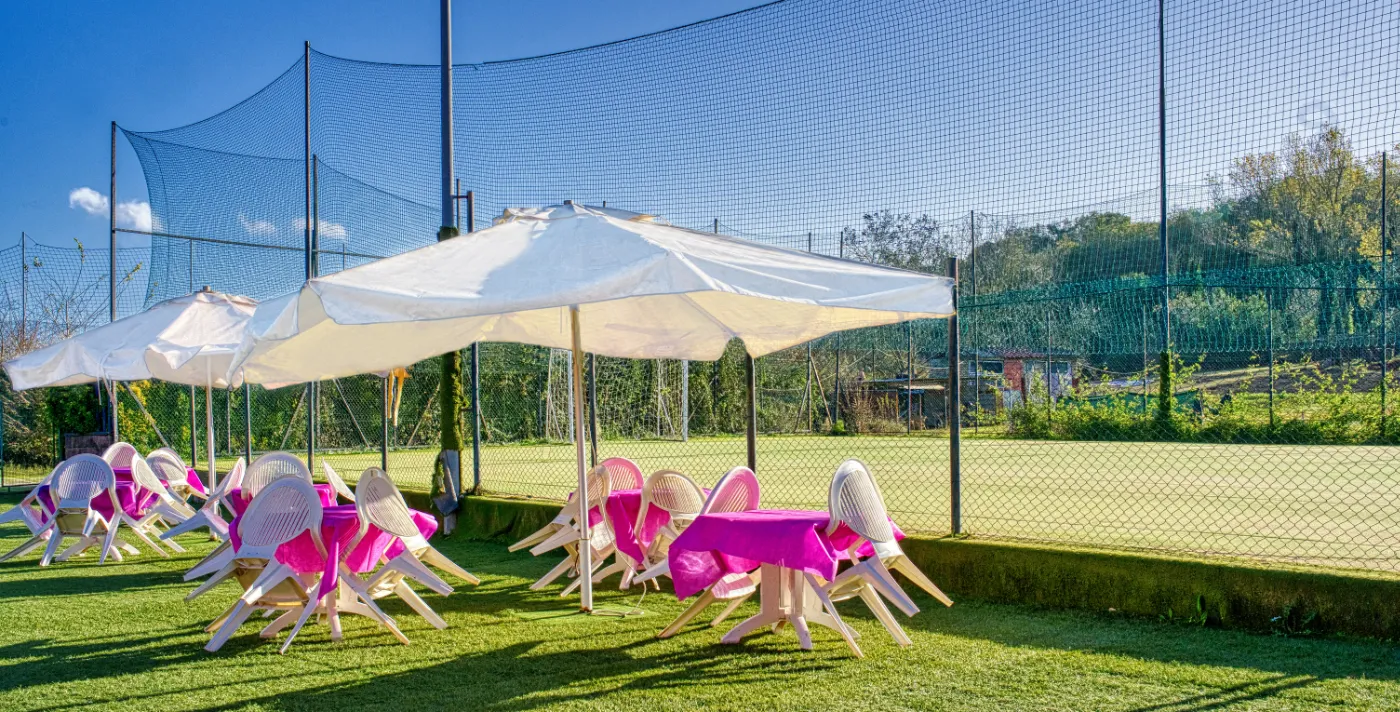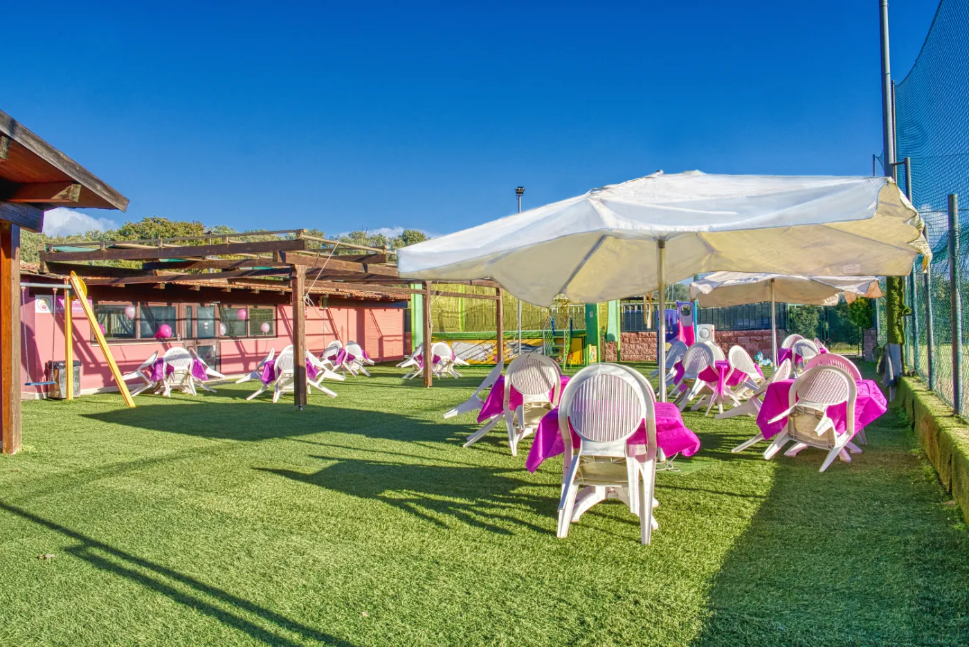 E’ dotata di servizi, ampio spazio esterno in cui troverete anche un tappeto elastico, adatto per i più piccini, e un campo di calcetto.